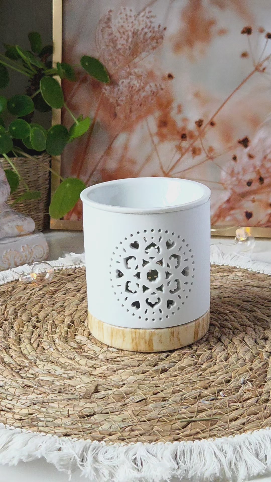This elegant white ceramic aroma lamp combines minimalist design with a delicate mandala cut-out pattern. When lit with a tealight candle, it creates a soft decorative glow and a calm, atmospheric ambiance.